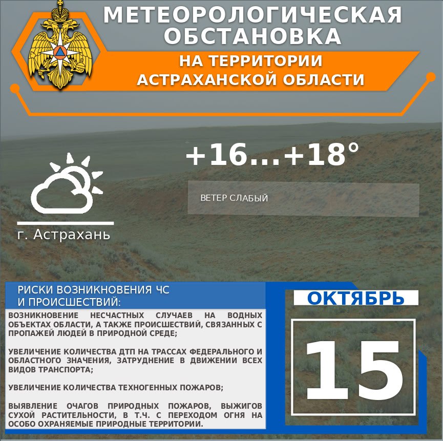 По г. Астрахань переменная облачность. Без осадков. Ветер слабый. Температура воздуха днем +16...+18°, ночью +7...+9°.