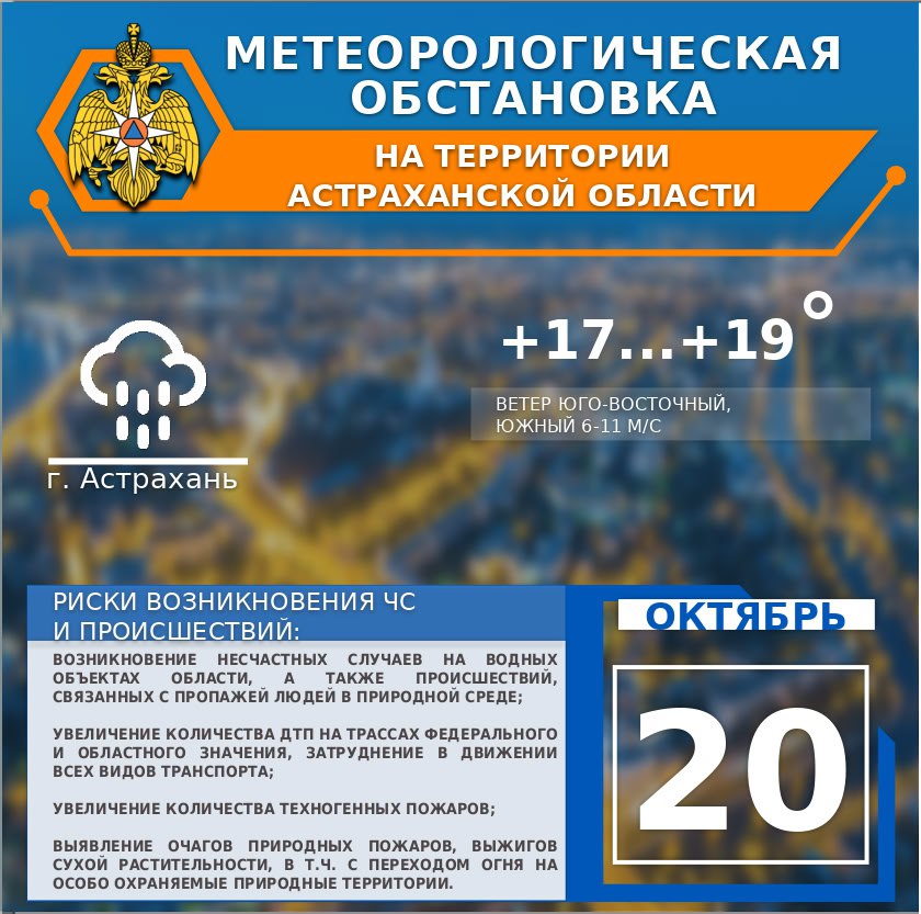 По г. Астрахань облачно. Небольшой дождь. Ветер юго-восточный, южный 6-11 м/с. Температура воздуха днем +17...+19°, ночью +8...+10°.