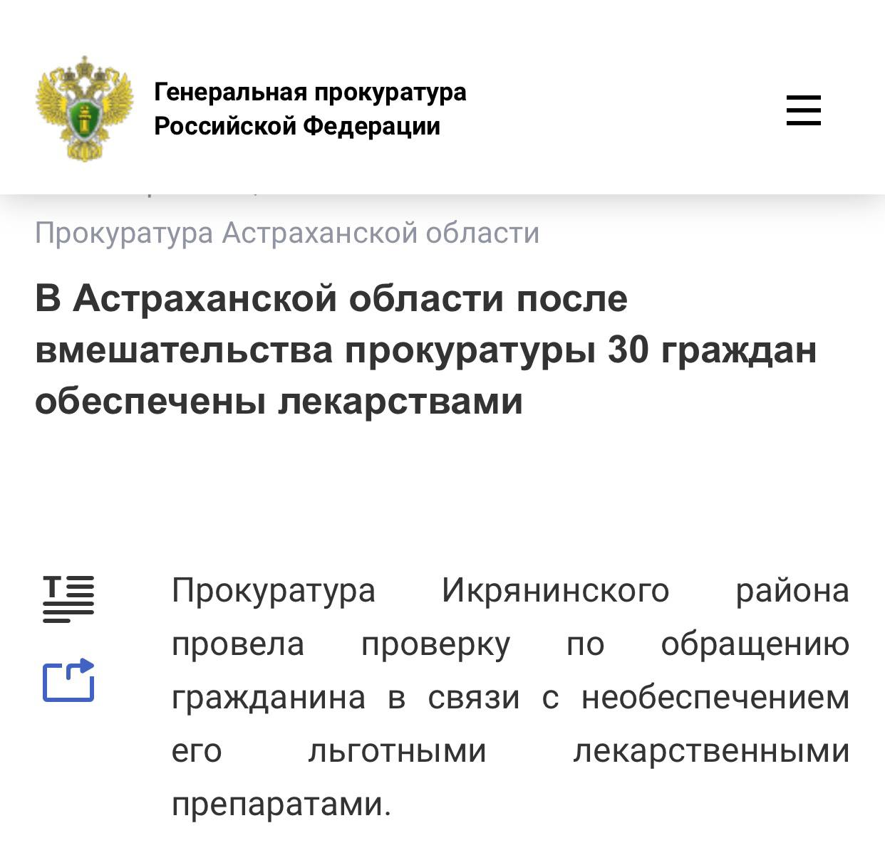 По представлению прокуратуры Икрянинского района, внесенному главному врачу районной больницы, проведена замена ранее назначенных лекарств на аналоги, организована закупка медикаментов, в территориальный аптечный пункт поступило около 20 наименований лекарств.