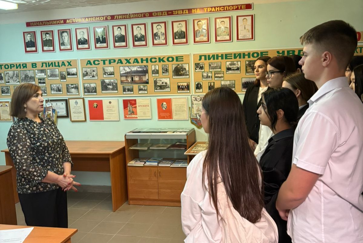 Специалист ГМПО ОРЛС Астраханского ЛО МВД России на транспорте Елена Булычева пригласила ребят в музей линейного подразделения, где рассказала ребятам об истории развития транспортной полиции в России, о сотрудниках, стоявших у истоков развития Астраханского ЛО. Вниманию студентов были представлены экспонаты музея, альбомы, фотографии, рукописные воспоминания ветеранов линейного подразделения, стенды о сотрудниках-воинах интернационалистах и участниках боевых действий в СКР и на СВО.