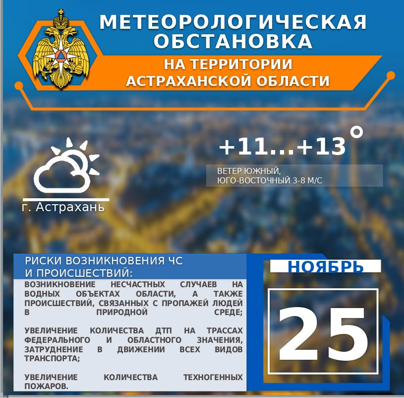 По г. Астрахань облачно с прояснениями. Без существенных осадков. Ветер северо-западный 3-8 м/с. Температура воздуха днем +11...+13°, ночью +6...+8.