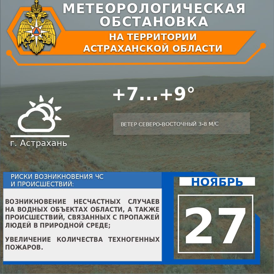 По г. Астрахань переменная облачность. Без существенных осадков. Ветер северо-восточный 3-8 м/с. Температура воздуха днем +7...+9°, ночью -2...+0°.