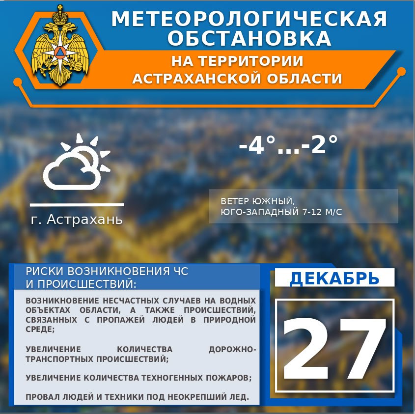 По г. Астрахань облачно с прояснениями. Без существенных осадков. Местами небольшие осадки преимущественно в виде снега, гололедно-изморозевые отложения. На дорогах местами гололедица. Ветер юго-восточный, восточный 6-11 м/с. Температура воздуха 0…+2°.