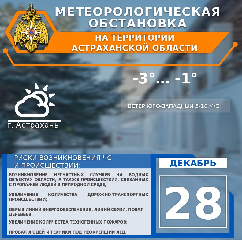 По г. Астрахань облачно с прояснениями. Без существенных осадков. Туман, гололедные явления. На дорогах гололедица. Ветер юго-западный 5-10 м/с. Температура воздуха -3…-1°.