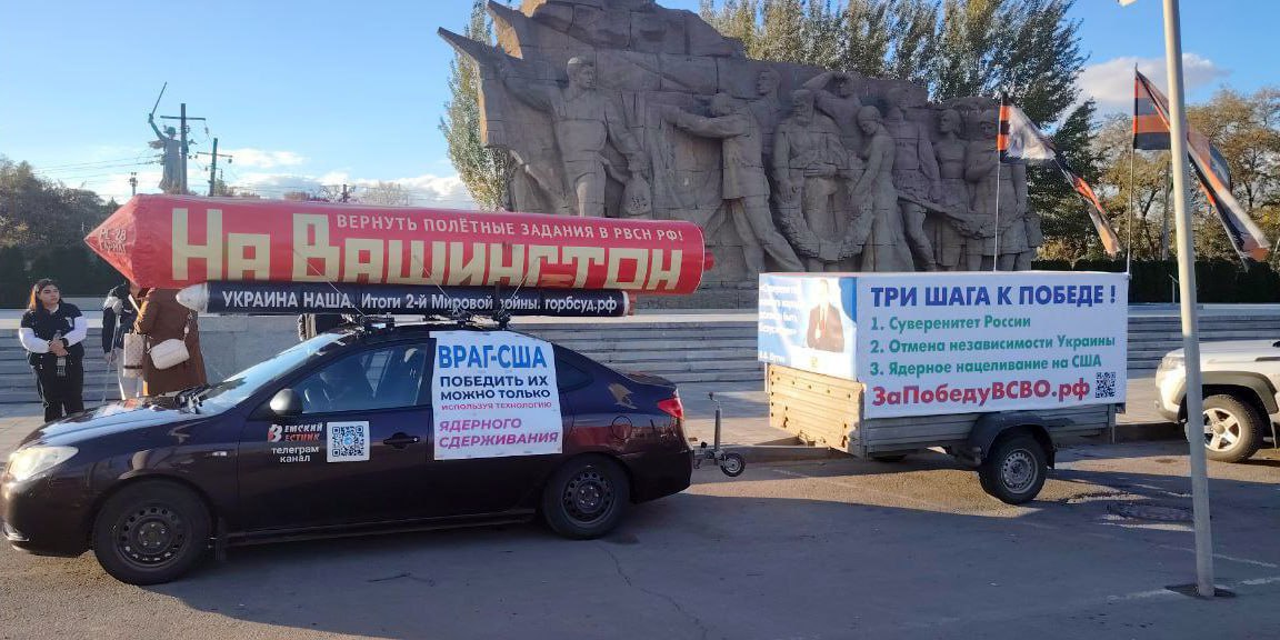 Транспортное средство, пропагандирующее «повестку плана Победы России в противостоянии с США» включает российский суверенитет, отмену независимости Украины и ядерное нацеливание на США, проводит автопробег по городам России.