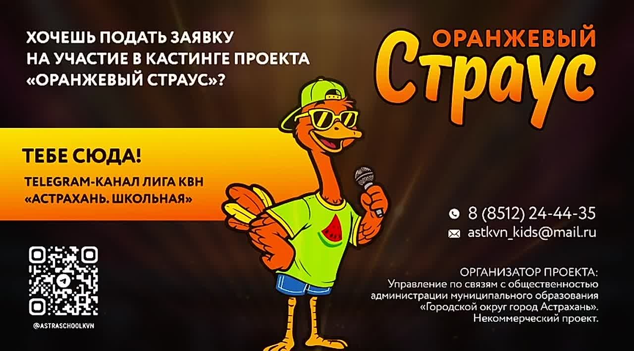 Если ты школьник и хочешь выступать (а может быть уже выступаешь) в жанре стендап, импровизация, пародия, миниатюра, музыкальные карапули или у тебя собственный авторский стиль - тогда заполняй заявку на участие в кастинге первого в Астрахани детского юмористического движа «Оранжевый страус»!