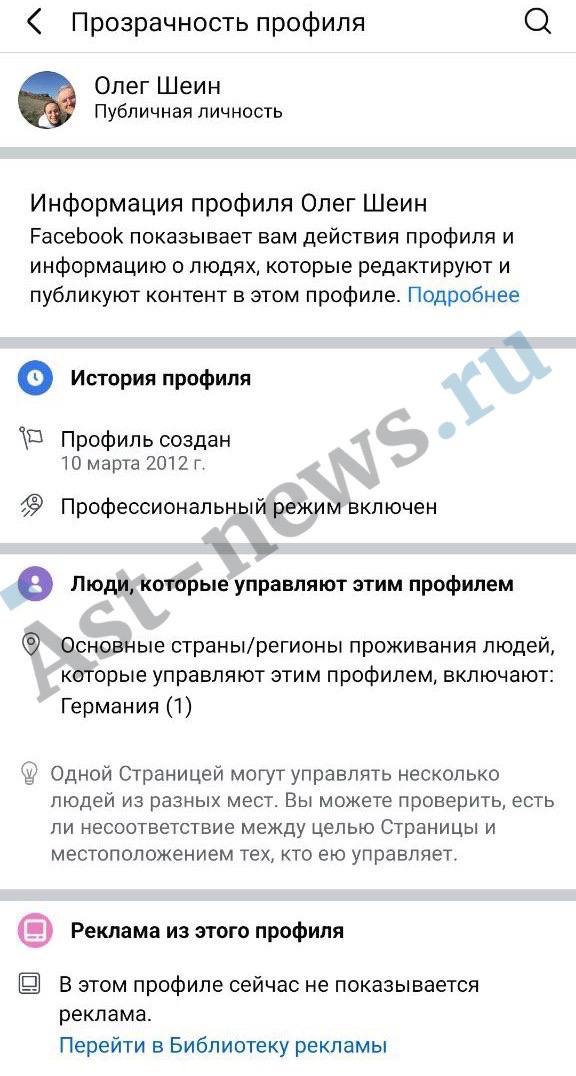 Бывший депутат Думы Астраханской области Олег Шеин* в настоящее время находится на территории Германии, выяснил AST-NEWS.ru. Об этом свидетельствуют данные о «прозрачности профиля» страницы Шеина* в Facebook**: в разделе «Основные страны/регионы проживания людей, которые управляют этим профилем» указано «Германия».