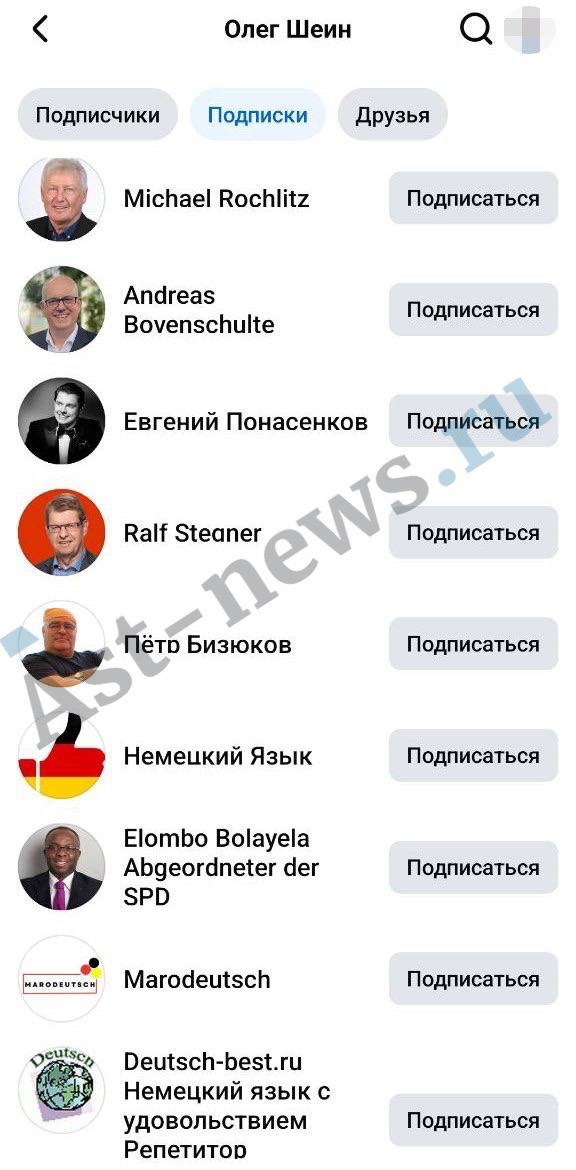Кроме того, среди свежих подписок Шеина* в Facebook** – страницы видных немецких политиков: члена Бундестага Германии Андреаса Бовеншульте, депутата бундестага, эксперта по внешней политике правящей Социал-демократической партии Германии Ральфа Стегнера, депутата парламента Бремена Эломбо Болаела, а также русскоязычные группы по изучению немецкого языка.