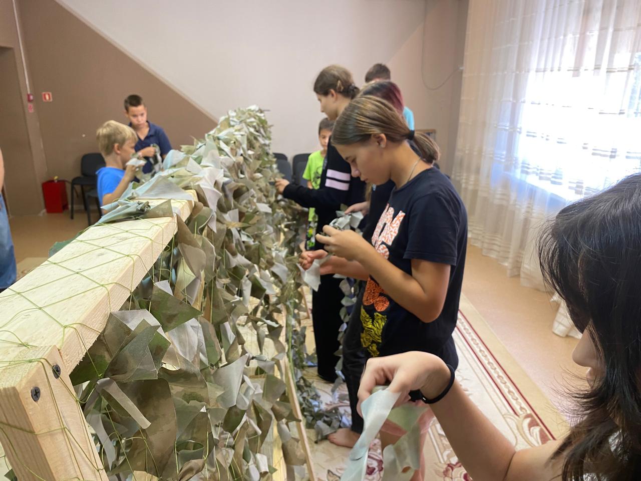 Ребята создают масксети под руководством наставников. Они нарезают лоскуты нужного размера и вплетают их в сеть, вкладывая в свою работу душу и тепло.