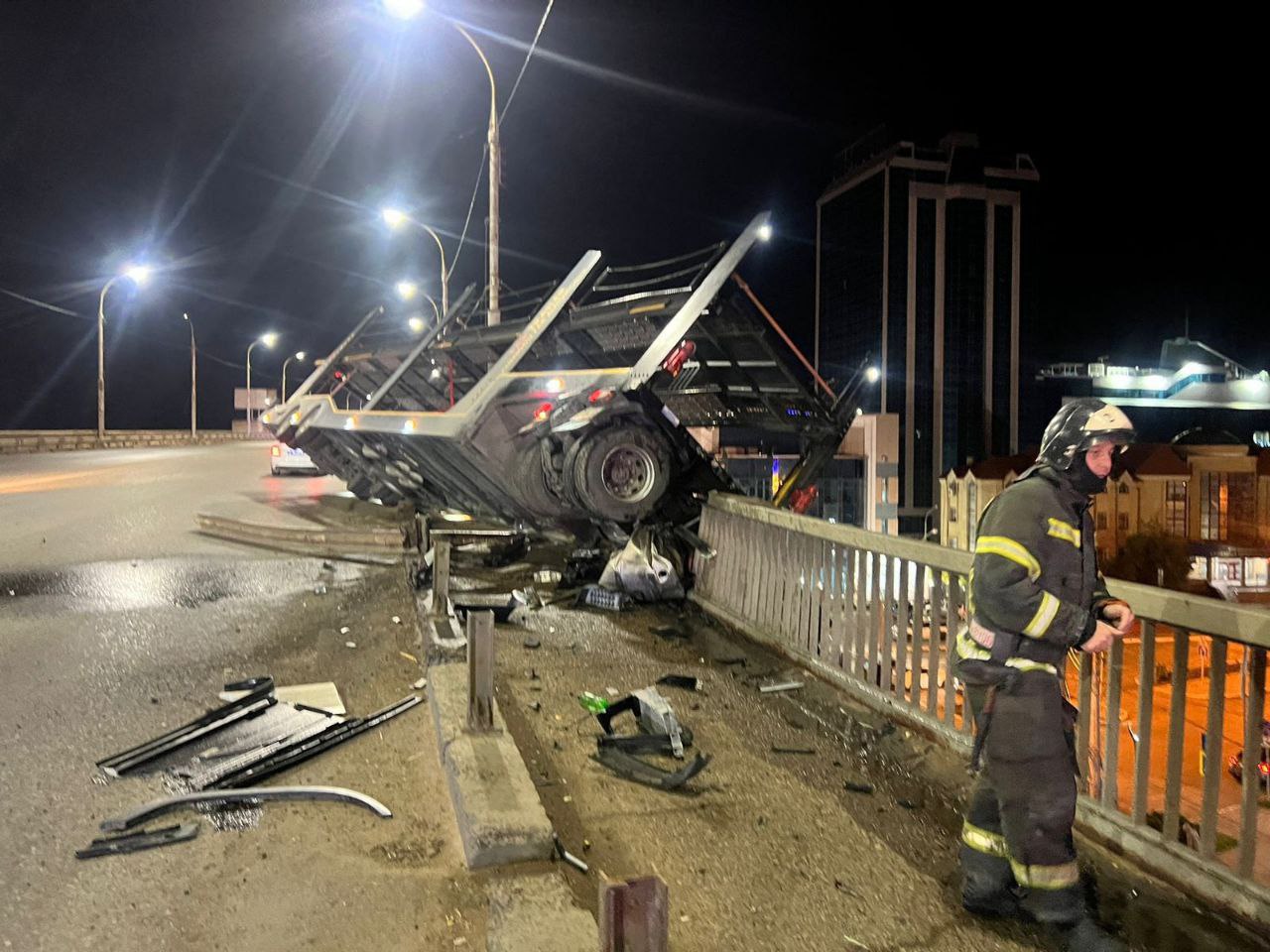Предварительно, 49-летний водитель почувствовал недомогание и резко затормозил, после чего грузовик съехал с дороги и повис на леерном ограждении моста.