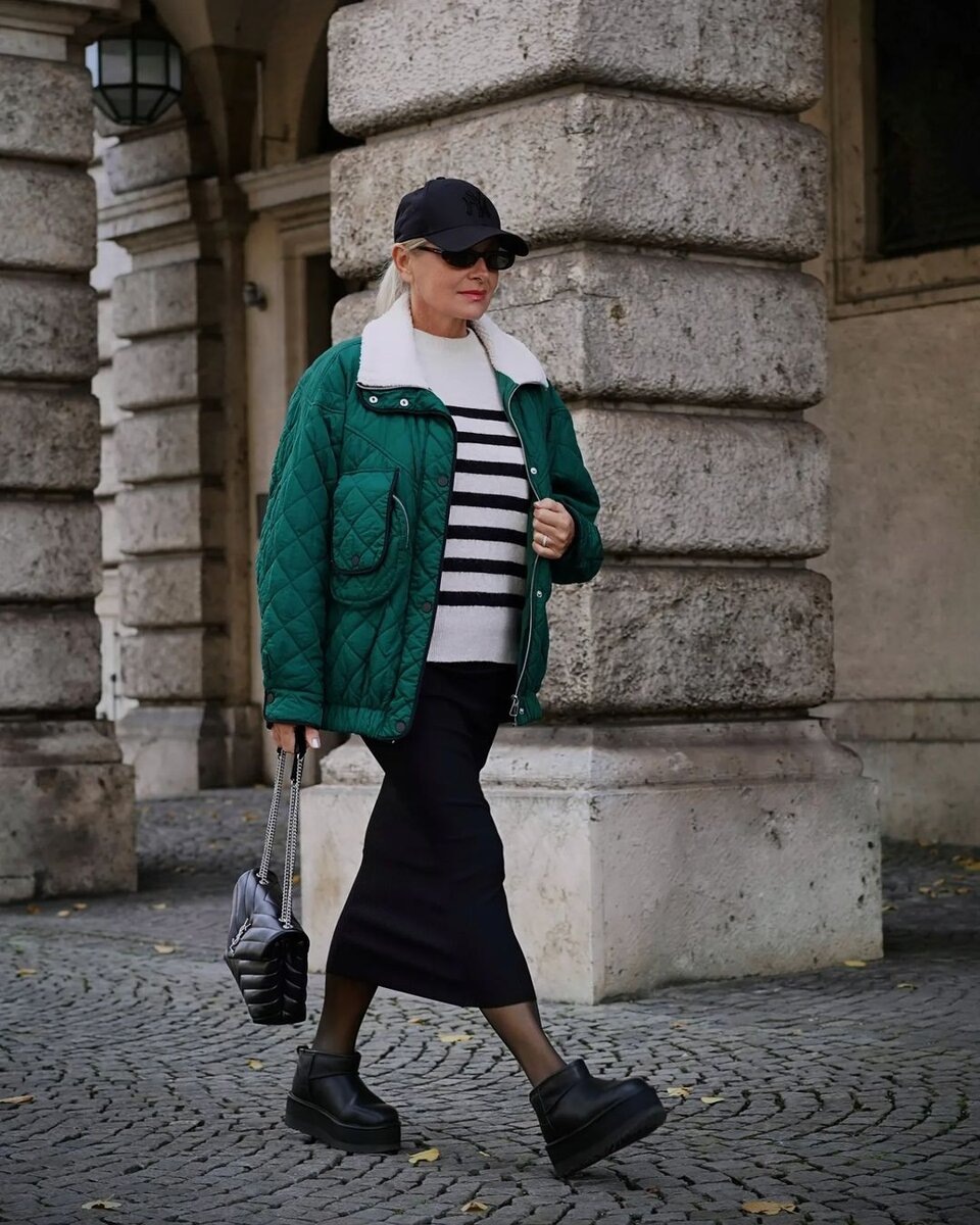 - Многослойные комбинации: В прохладную погоду можно создать стильный многослойный look с темной юбкой миди и светлым свитером. Добавление стеганой куртки изумрудного цвета станет ярким акцентом и завершит наряд в сочетании с черными ботинками на тракторной подошве.