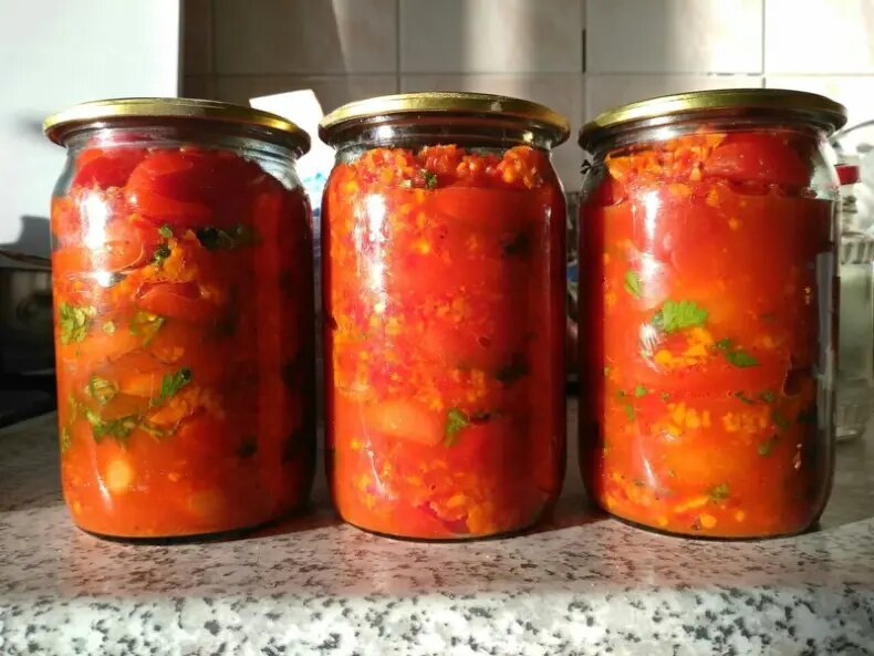 Получившуюся закуску раскладывают по стерилизованным банкам и закрывают крышками. Для стерилизации банки ставятся в кастрюлю, дно которой желательно накрыть полотенцем, а сама кастрюля заполняется водой так, чтобы она покрывала банки до плечиков. Довести до кипения и стерилизовать около 10 минут. Закатанные банки укрываются полотенцем до полного остывания. После остывания их можно перенести в прохладное место для хранения.