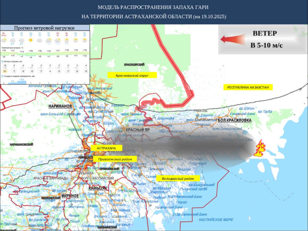 Астраханское МЧС сообщает, что в результате ландшафтных пожаров в Казахстане, с учетом восточного направления ветра 5-10 м/с, в воздухе присутствует запах гари в центральных и южных районах области, в том числе Астрахани. Действующих пожаров на территории региона нет.