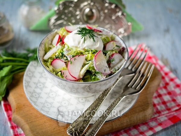 - Салат из пекинской капусты и редиски: Смешайте мелко нашинкованную пекинскую капусту, нарезанную тонкими кружочками редиску и зелень. Заправьте это творение сметаной и приправьте по вкусу.