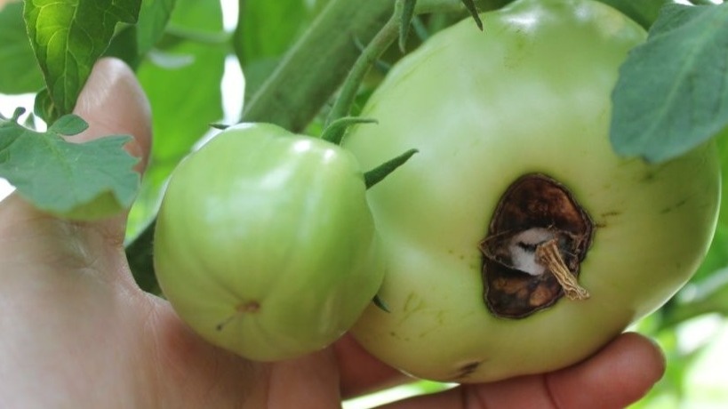 Первые симптомы гнили проявляются в виде темных пятен, образующихся на томатах в местах, где располагались цветы. Чаще всего такие повреждения выглядят сухими, а в редких случаях могут быть и мокрыми. Как только проявляется вершинная гниль, плоды становятся непригодными для еды, и, к сожалению, их уже невозможно спасти.