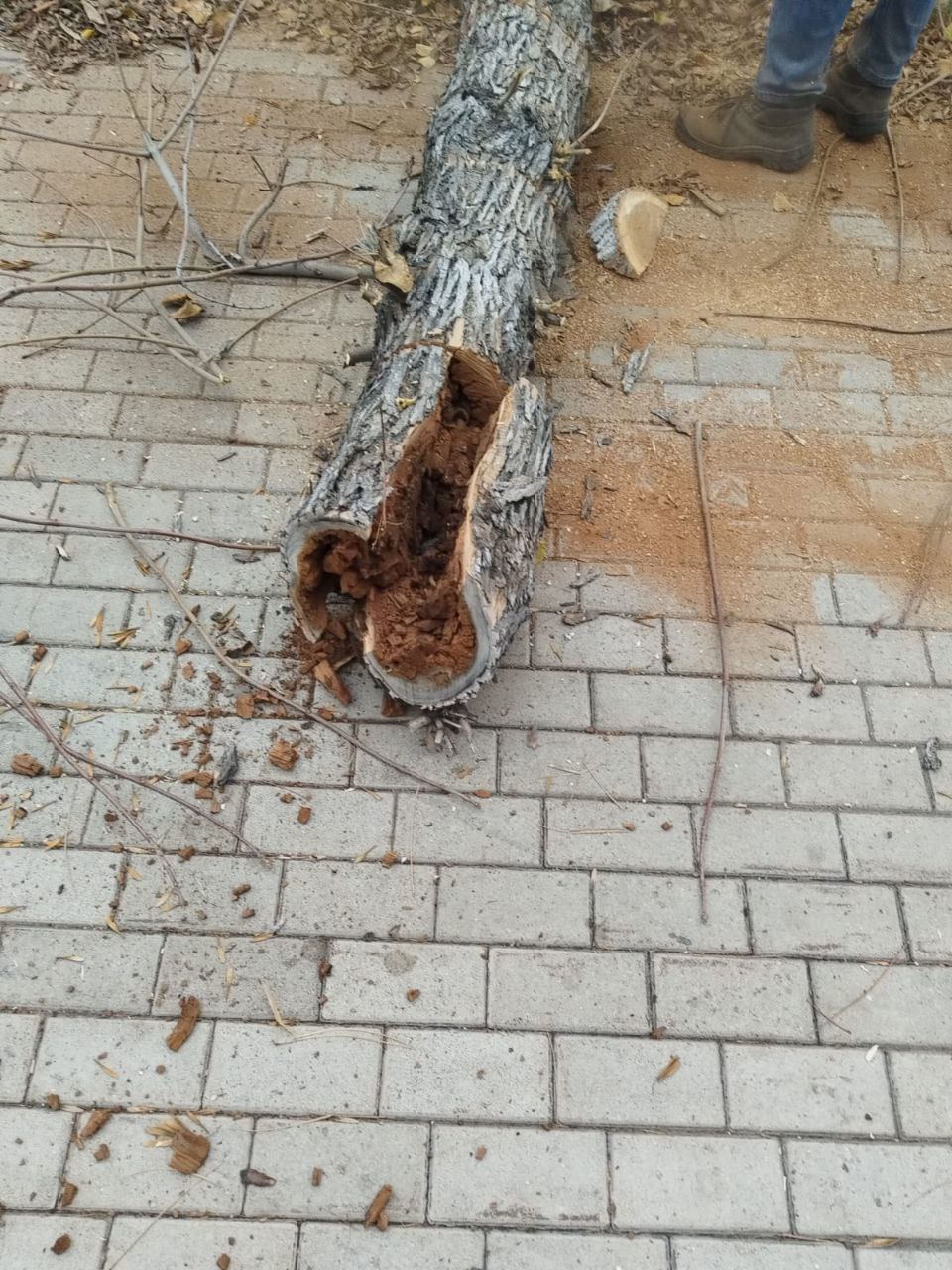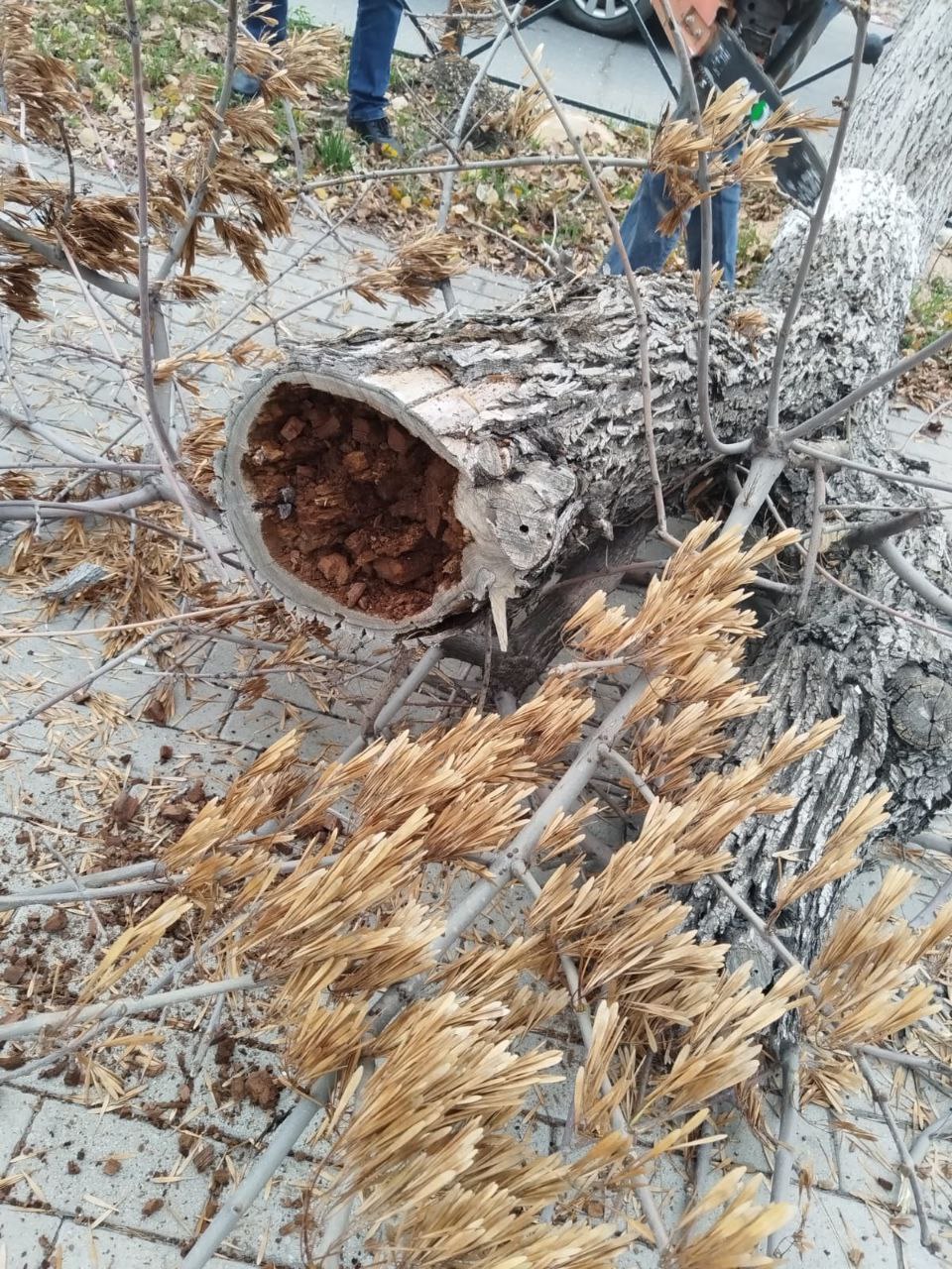 Многие деревья, растущие здесь, уже трухлявые и аварийные. Приступили сегодня к первому этапу работ - опиловке таких зелёных насаждений вдоль придорожной части по ул. Ленина. На фото видно, что внутри стволы пустые, а это могло привести к падению зелёных насаждений и трагедии.