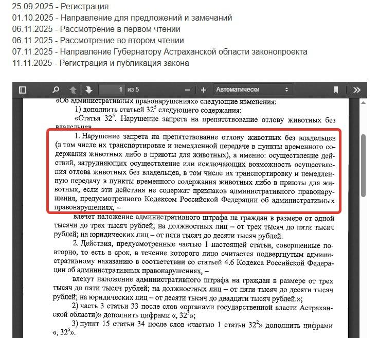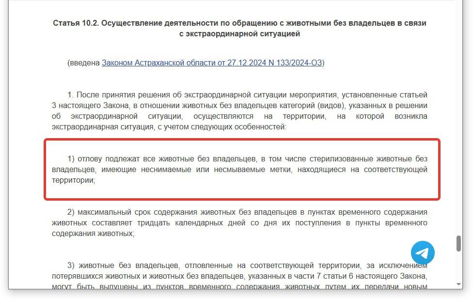 Согласно закону Астраханской области от 27 декабря 2023 года N 129/2023-ОЗ, в период действия режима экстраординарной ситуации на всей территории Астрахани, а также Приволжского района подлежат отлову все безнадзорные собаки, включая стерилизованных и имеющих не снимаемые и не смываемые метки.