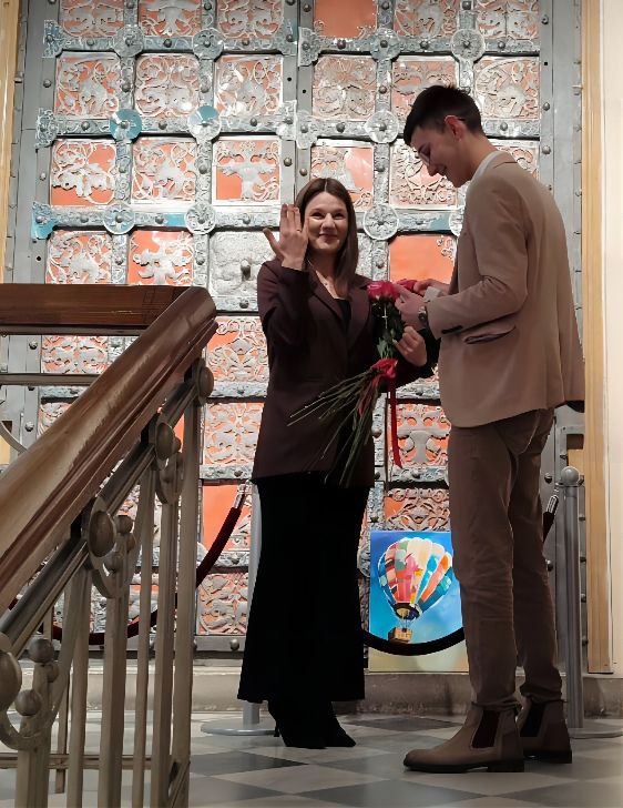 "Всё было сделано по правилам: кольцо, которое молодой человек вручил, встав на колено, признание в любви и предложение выйти замуж. Девушка, конечно, согласилась, и друзья пары, и сотрудники поздравили молодых людей", - говорится в сообщении.
