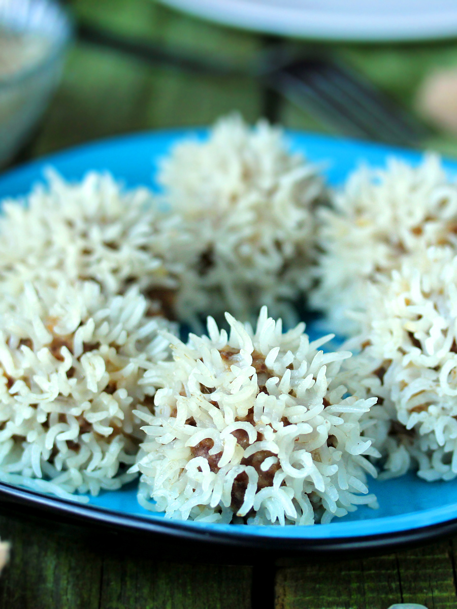 Главная хитрость заключается в том, что рис не смешивается с фаршем, а тщательно облепляет каждую тефтельку. Приготовленные на пару, рисовые «иголочки» становятся мягкими и развиваются, создавая эффект милых ёжиков на тарелке. Блюдо лучше всего сервировать горячим: в остывших тефтельках рис может стать жестким, но они настолько вкусны, что вряд ли смогут дотянуть до этого момента.
