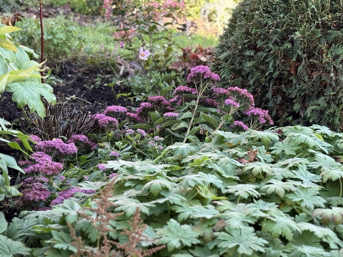 Некоторые растения, такие как бадан, очитки низкорослые, почвопокровные флоксы и хосты, можно оставить без изменений. Например: