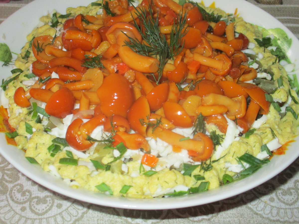 Затем укладывают нарезанные малосольные огурцы и натертые на крупной терке белки вареных яиц. В самом центре выкладываются маринованные опята, которые добавят нотки хрустящей свежести. Завершает оформление укропом и мелко нарезанным луком, что придаст блюду яркий вид.