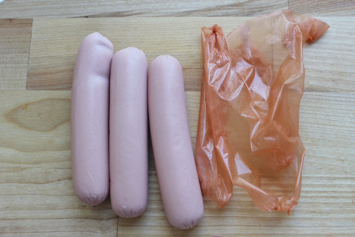 Первым делом сосиски нужно очистить от оболочки. Это важно, особенно если она не натуральная – в таком случае лучше снять ее. Затем на сковороде разогреть немного масла и аккуратно нарезать сосиски. Их можно готовить как на сковороде, так и в сыром виде – все зависит от предпочтений.