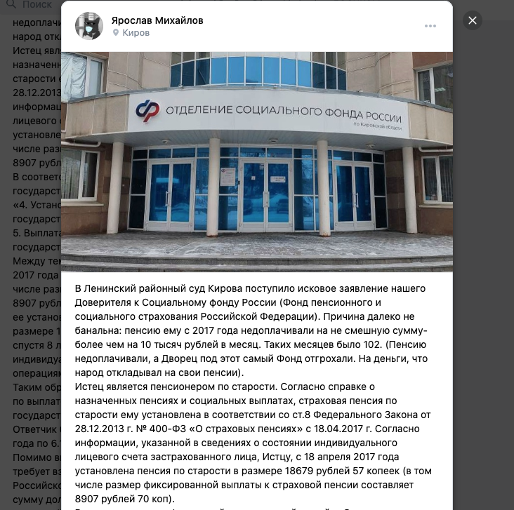 Судебное разбирательство по данному делу пройдет в Ленинском районном суде города Кирова. Доверитель пенсионерки подал претензию в Социальный фонд, но их ответ был игнорирован.