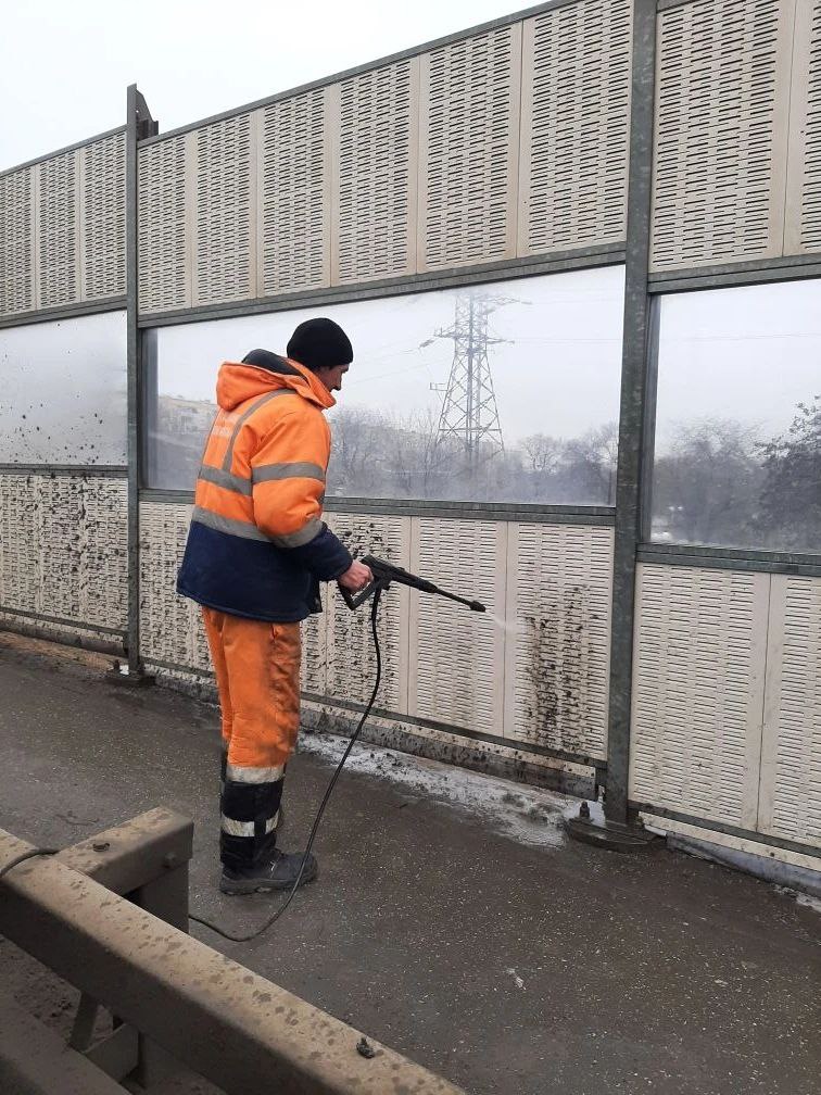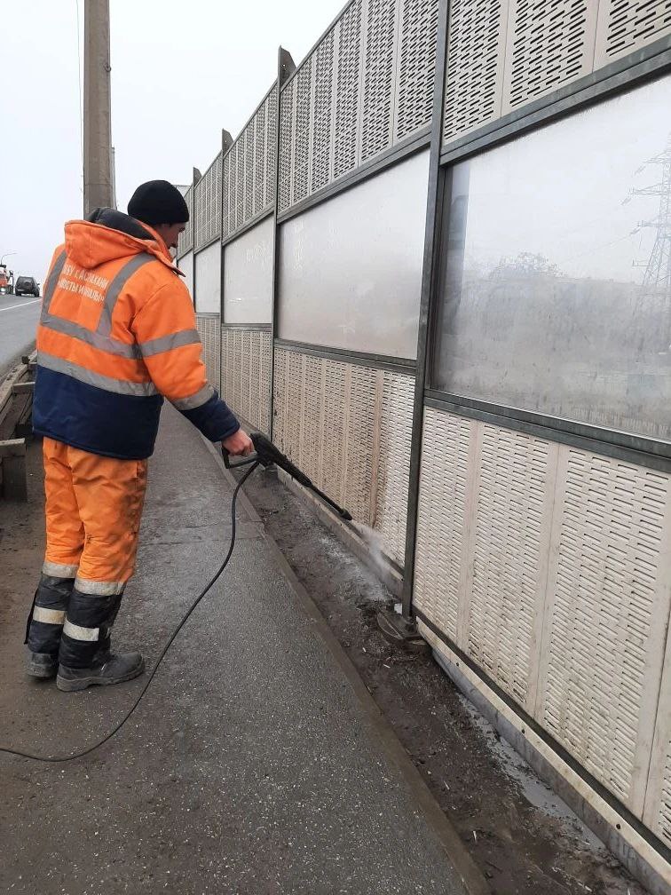 Специалисты другого муниципального предприятия – «Мосты и каналы» продолжают поддерживать порядок на мостовых сооружениях. К примеру, сегодня мыли шумовые экраны на путепроводе Вокзальном.