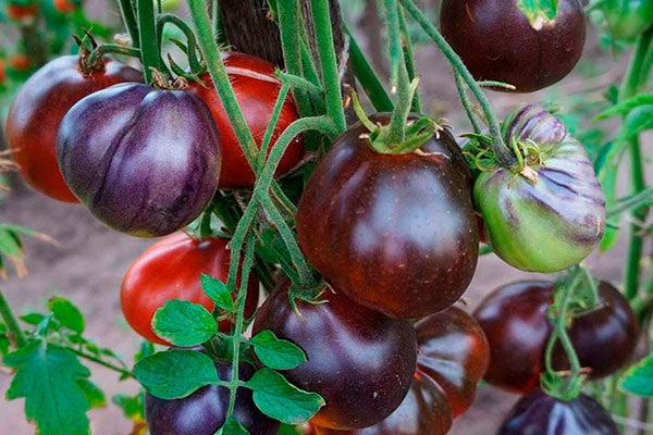 Кусты Синей груши могут достигать 2 метров в высоту и имеют редкую листву. Плоды грушевидной формы с гладкой поверхностью имеют интересный цвет – от светло-зеленого с темной «короной» до красно-коричневого с синеватым пятном у плодоножки. Эти помидоры достигают 10 см в диаметре и весом от 120 до 200 граммов с мясистой и сочной мякотью.