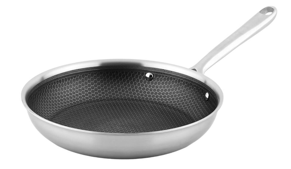 Например, сковорода 3Ply Etalon с лазерным напылением устойчива к царапинам и допускает использование металлических лопаток, но для ее щадящего ухода рекомендуется ручная мойка.