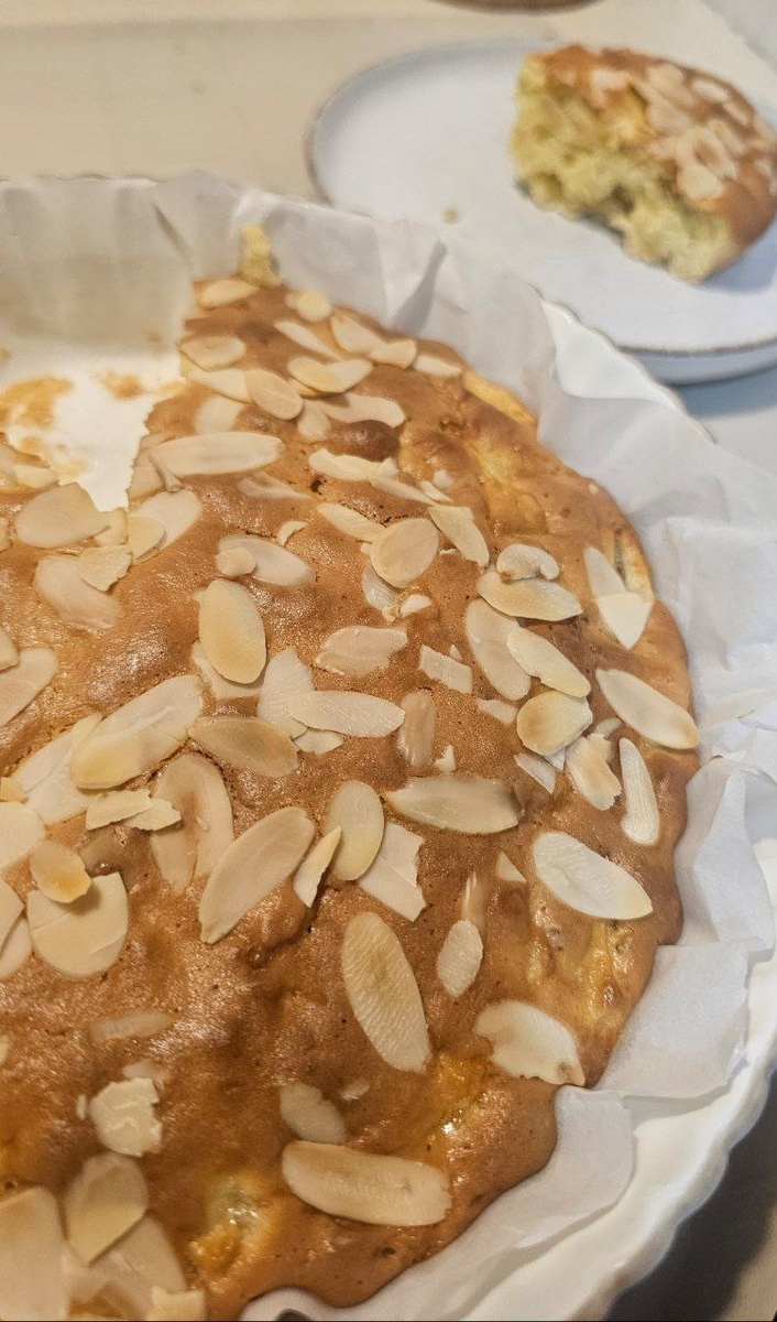 К тесту постепенно присоединяют размягченное сливочное масло и мягко перемешанные яблоки, а финальный штрих — щепотка корицы и миндальные лепестки, которые придают характерный аромат и лёгкую текстуру.