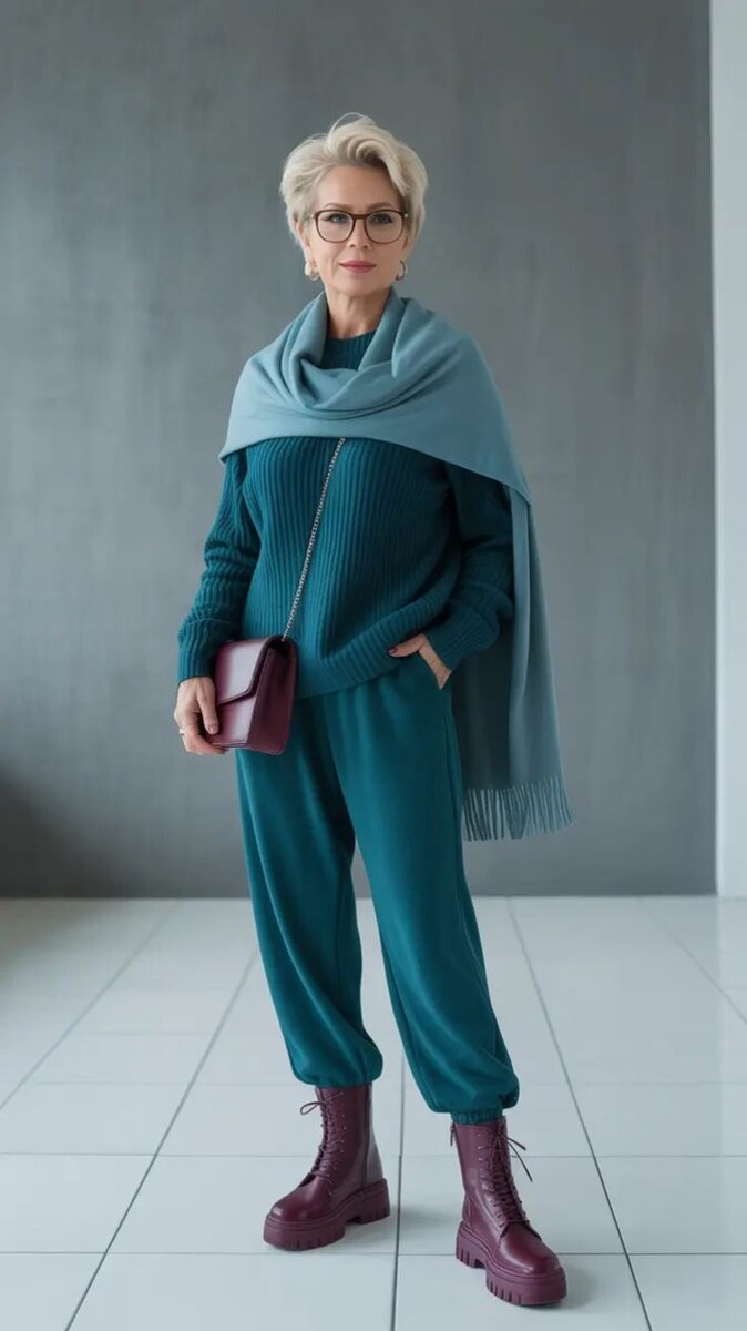 1. Элегантный и практичный выбор для 50+: штаны цвета изумрудной группы и лаконичный джемпер с акцентом на обувь, гармонично дополненные палантином, который играет роль яркого штриха.