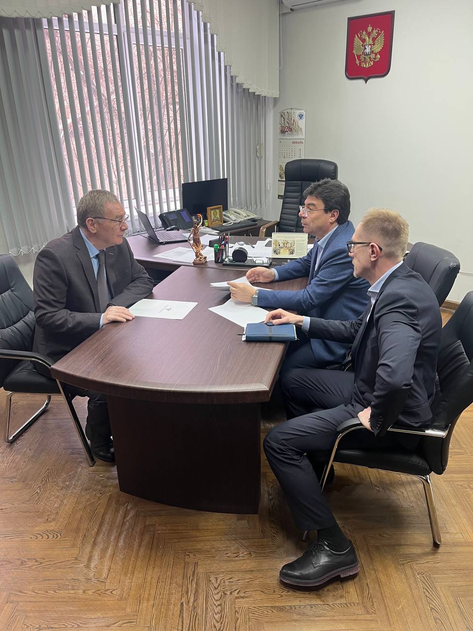 Состоялась рабочая встреча председателя избирательной комиссии Астраханской области Владимира Золотокопова с начальником управления специальной связи по Астраханской области ФГУП «Главный центр специальной связи» Асланбеком Блиевым, на которой они обсудили вопросы доставки избирательной документации в период подготовки и проведения избирательной кампании на выборах в единый день голосования 2026 года.
