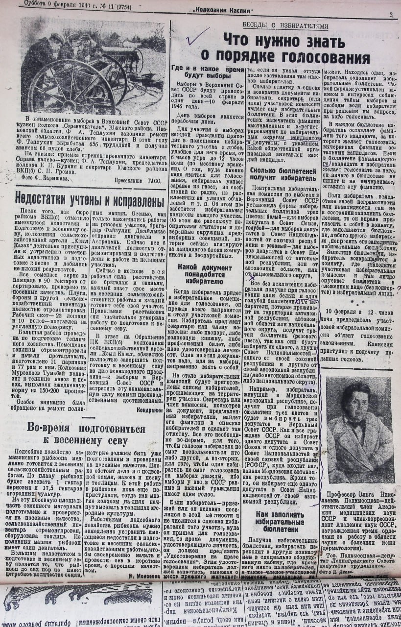 10 февраля 1946 года на избирательных участках царила праздничная атмосфера: они были украшены цветами, агитплакатами, знаменами, полы застелены самоткаными дорожками, а столы накрыты красной тканью. Впервые на таких масштабных выборах было применено голосование «на дому».