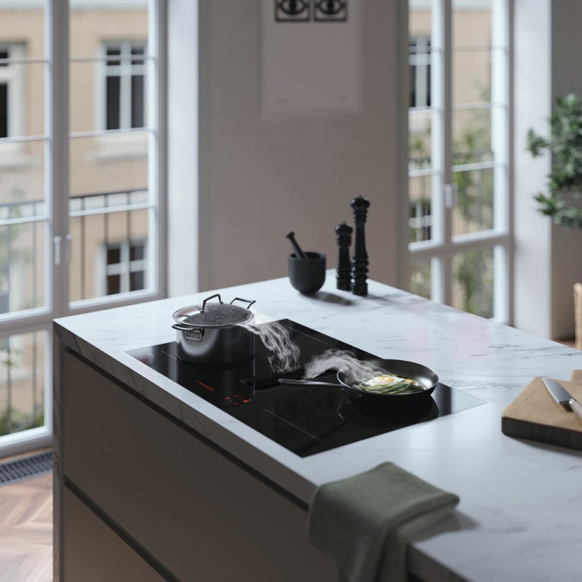 Вытяжка, интегрированная в центр индукционной варочной панели, поднимается только при необходимости, предоставляя кулинару больше свободного пространства на рабочей поверхности. Эта умная инженерная находка обеспечивает удобное использование, позволяя сосредоточиться на приготовлении блюд, не отвлекаясь на лишние детали.
