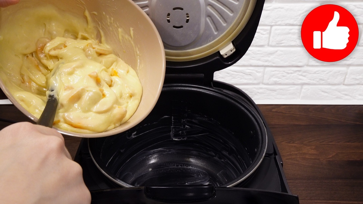 Млячита смазывают маслом чашу мультиварки и выливают туда тесто. Выпекают на режиме выпечка или при 130°С на мультиповаре около часа. По готовности шарлотку легко вынимают корзиной пароварки и украшают глазурью из сгущённого молока и какао, а вокруг кладут ломтики абрикоса для декоративности.