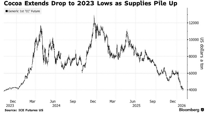 Недавние фьючерсы на какао продолжили катастрофическое падение, потеряв 5,4% и опустившись ниже отметки 4000 долларов за тонну, хотя и попытались частично восстановить свои позиции. В этом году цены снизились более чем на 30% из-за опасений, связанных с уменьшением спроса и возможным избытком предложения, который превысил прогнозы экспертов.