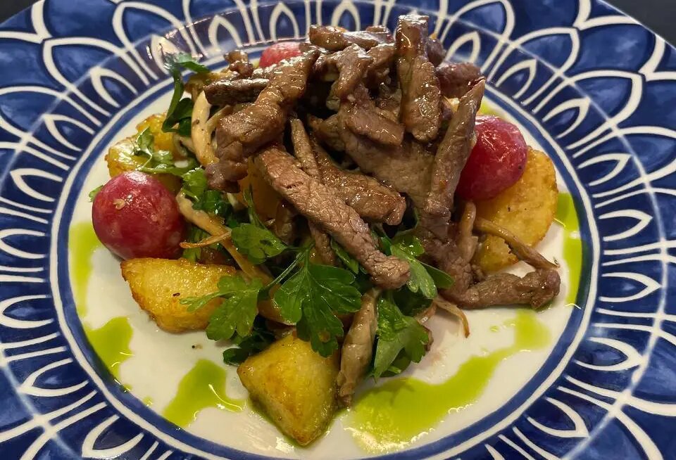 Мякоть говядины нарезать брусочками и обжарить с солью, перцем и растительным маслом до румяности. В конце добавить кисло-сладкий соус. Отварной картофель можно нарезать и обжарить с вешенками, чесноком и солью. Все ингредиенты соединить в миске и украсить обжаренной говядиной. Подаётся как в теплом, так и в холодном виде.