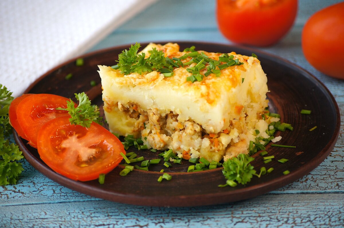 Как только все компоненты готовы, можно начинать сборку. В огнеупорное блюдо выложите часть картофельного пюре, разровняйте и создайте бортики. На картофель аккуратно уложите фарш, слегка его прижимая. Важно, чтобы всё это было горячим — так слои лучше скрепятся.