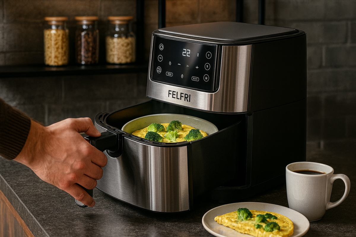 Завтрак — это время, когда важны простота и скорость. Для тех, кто хочет насладиться нежным омлетом с брокколи, не тратя много времени на готовку и уборку, идеальным решением станет использование аэрогриля. Ниже представлены пошаговые инструкции с точными температурами и временем для аэрогриля FELFRI 5,5 л / 1800 Вт.