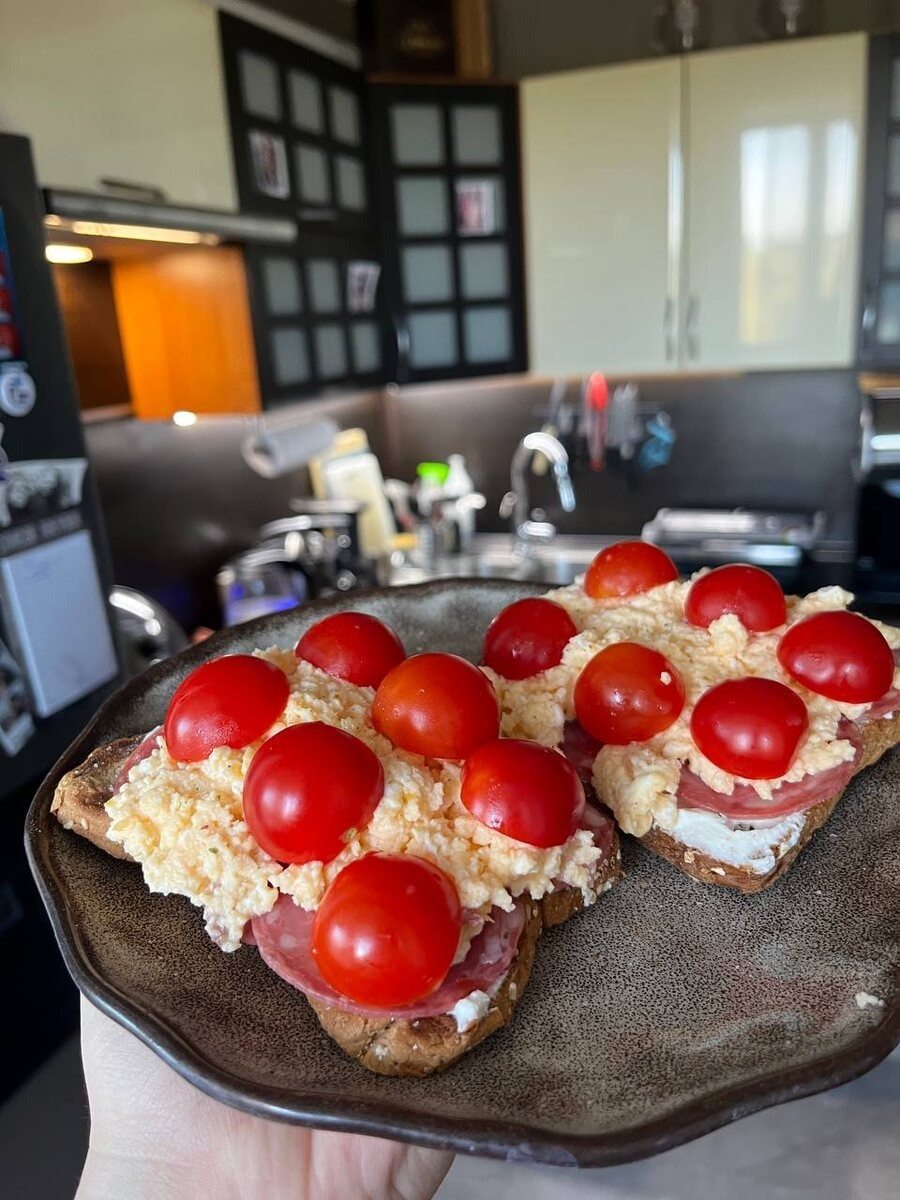 Чтобы приготовить это прекрасное блюдо, необходимо взбить яйца с молоком и сыром, обжарить бекон и добавить яичную смесь, помешивая до кондиции мягкого скрэмбла. Параллельно поджарить хлеб на гриле или сковороде, намазать его творожным сыром, выложить колбасу, а сверху добавить теплый скрэмбл и дольки черри.