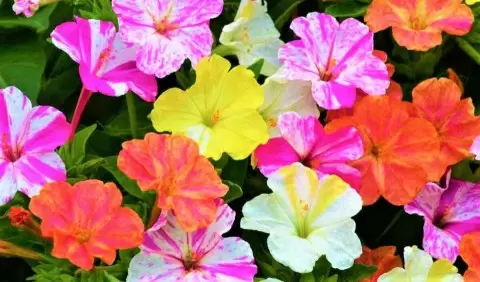 Высота кустиков мирабилиса колеблется от 30 до 80 см, а их плотные, раскидистые побеги создают впечатление пышной зелени. Листва насыщенно-зеленая, а её фон служит выразительным контрастом для ярких соцветий. Цветовая гамма разнообразна: от классических розовых и белых до насыщенных малиновых оттенков, включая сорта с многоцветными лепестками и оригинальными мраморными узорами.
