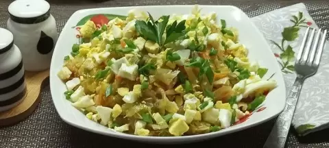 Как только капуста будет готова, ее нужно аккуратно выложить на тарелку и дать немного остыть. Почистите вареные яйца и нарежьте их кубиками, добавьте к капусте. Завершите оформление блюда, украсив его резаными перьями зеленого лука и свежей петрушкой. Такой яркий и аппетитный салат станет изюминкой вашего стола!