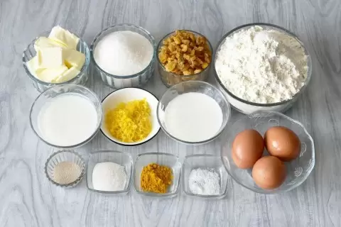 Ингредиенты собираются как обычный набор на кухне: мука, сахар, изюм, масло, молоко и цедра одного лимона. Мягко расплавленное масло и тёплое молоко любят друг друга в опаре, а лимон даёт светлый акцент во вкусе, не перегружая сладость.