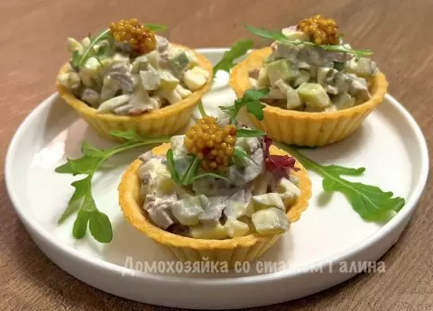 Получившуюся смесь раскладывают по тарталеткам и украшают зернистой горчицей и зеленью. Готово к подаче — красиво, уютно и празднично. Это ощущается как домашний уют на новогоднем столе.