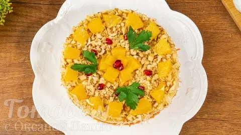 Приготовление начинается с подготовки изюма: его следует замочить в горячей воде на 10 минут. Затем курицу нарезают кубиками, морковь натирают на тёрке, а сыр — на мелкой. Обжарить грецкие орехи на сковороде до золотистого цвета, а потом нарезать. Сложите салат слоями в кулинарное кольцо, перемазывая каждый из них майонезом. Не забудьте украсить блюдо дольками апельсина, зернами граната и зеленью.