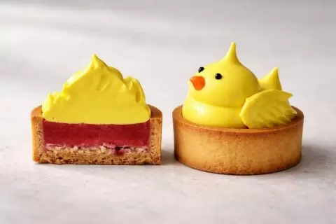 Цыплята, выполненные из меренги, не только добавляют весенний шарм, но и смягчают ягодную кислинку. Эти воздушные элементы помогают сбалансировать контраст вкусом и придают тарталетке легкость, без которой итоговый результат мог бы оказаться слишком резким.