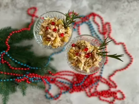 Праздничный салат с курицей и ананасами готов! Приятного аппетита!