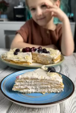Крем держится на простом сочетании творога, йогурта и фиников. Всё взбивается вместе и равномерно распределяется между блинами, образуя плавные переходы вкусов и кремовую нежность.