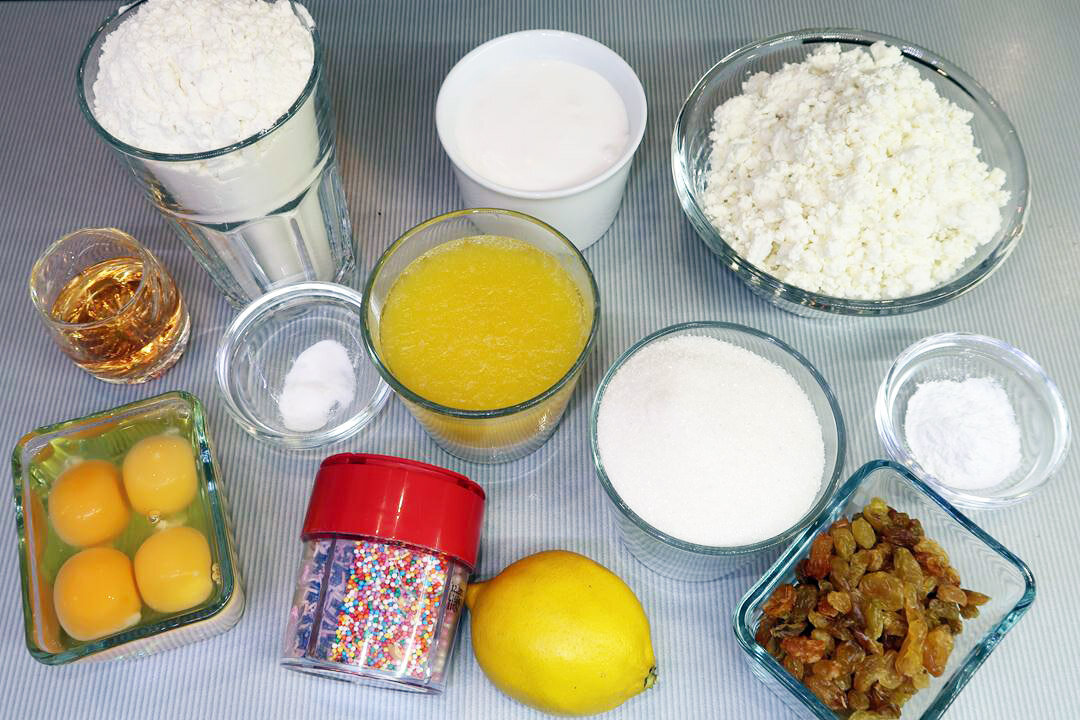 С лимона аккуратно снимите цедру и выжмите сок. Добавьте их в яичную массу и хорошо перемешайте. Затем добавьте творог и растопленное масло, снова взбивая все до однородной массы.